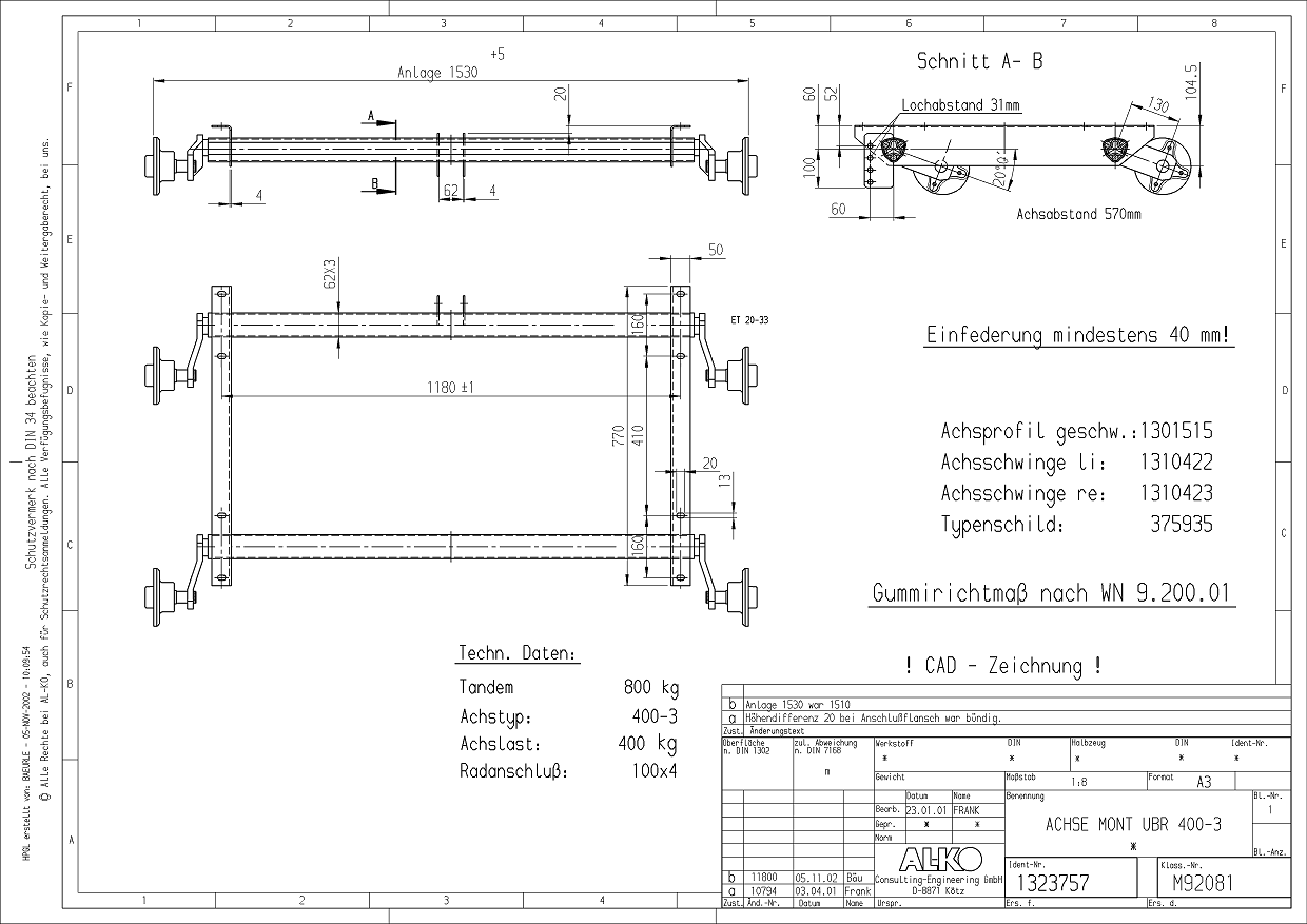 Akseli jarruton 800kg jarruton tandem AL-KO akseli laippaväli 1530mm 4X100