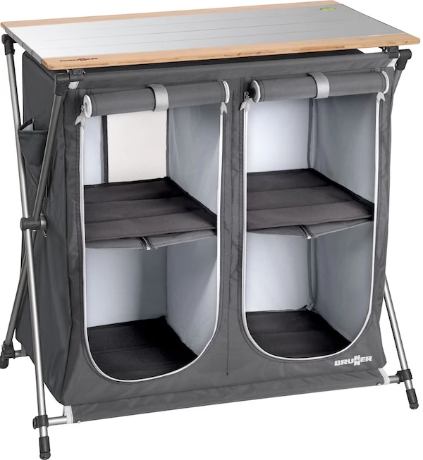 Erittäin kevyt ulkokeittiö, jossa on tukeva alumiinirunko ja tyylikäs, rullattava alumiininen peitelevy, jossa on bambusta valmistetut päätylevyt. Tilava, keskeltä jaettu kangaskaappi, jossa kussakin on 2 hyllyä ja vaalea sisäpinnoite. Hylly tarjoaa runsaasti säilytystilaa elintarvikkeille ja keittiötarvikkeille. Kaikkien jalkojen korkeutta saa säädettyä. Yksinkertainen, intuitiivinen kokoaminen ja purkaminen. Kompakti pakkauskoko.
