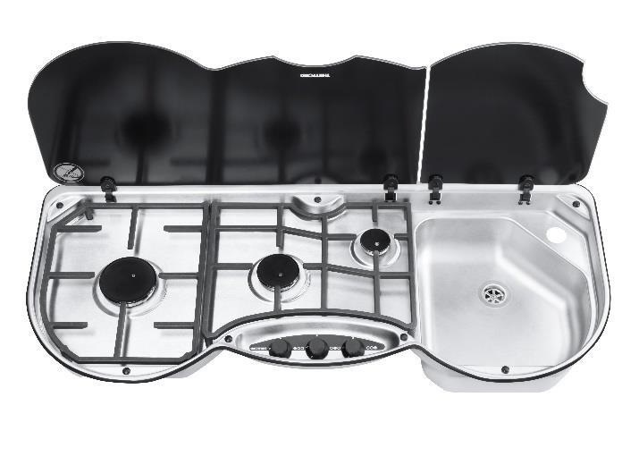 Thetford Series 353 Combination Unit. Mitat: korkeus 160mm, leveys 980mm, syvyys 410mm. 12V sytytys. 30 mbar. Kaasun kulutus max. 353.0 g/h. Vesihanan reikä Ø40 mm. Allas oikealla. Altaan sisämitat: korkeus 100, leveys 290, syvyys 321 mm.Viemäriliitos Ø25 mm letkulle. Takareunasta saranoidut lasikannet.Kolme kaasuliettä 1x 1,0 kW, 1x 1,5 kW ja 1x 2,4 kW.