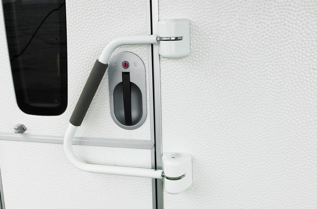 Avattuna turvakahva helpottaa kulkua ajoneuvoon ja suljettuna taittuu oven eteen jämeräksi, näkyväksi lukoksi.